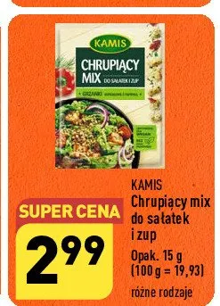 Cena produktu r贸偶ni si臋 w zale偶no艣ci od wybranego sklepu. Niestety nie posiadamy danych o aktualnych promocjach, jednak w艣r贸d archiwalnych ofert Chrupi膮cy mix Kamis kosztuje od 2,99 z艂 do 3,49 z艂.