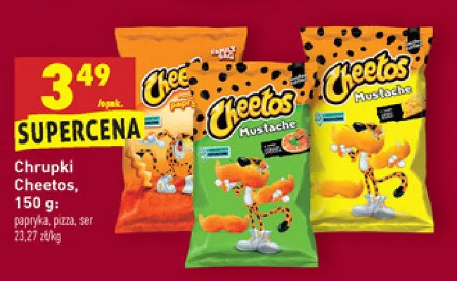 Cena produktu r贸偶ni si臋 w zale偶no艣ci od wybranego sklepu. Niestety nie posiadamy danych o aktualnych promocjach, jednak w艣r贸d archiwalnych ofert Chrupki mustache o smaku sera Cheetos Frito lay cheetos kosztuje od 3,49 z艂.