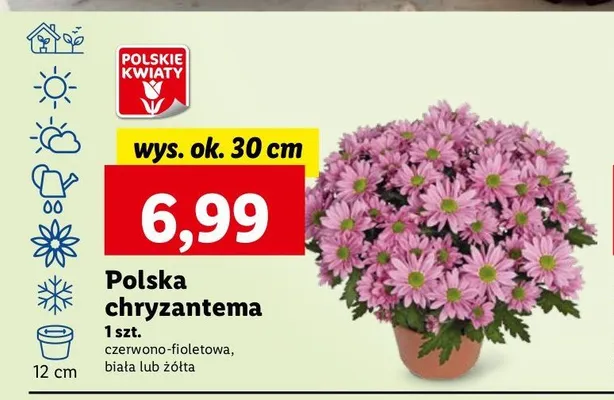 Zastanawiasz si臋, gdzie kupi膰 i ile kosztuje produkt Chryzantema czerwono-fioletowa 30 cm? Regularnie sprawdzamy, czy jest promocja na ten produkt w Biedronka, Lidl, Kaufland, Auchan, Netto, Makro i innych sklepach. Aktualnie nie posiadamy ofert promocyjnych na ten produkt.