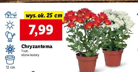 Cena produktu r贸偶ni si臋 w zale偶no艣ci od wybranego sklepu. Produkt Chryzantema doniczka wys. 25 cm mo偶esz kupi膰 w promocji ju偶 od 4,99 z艂 do 24,99 z艂. Najta艅sza oferta, jak膮 mamy w naszej bazie jest z sieci Aldi. Chryzantema doniczka wys. 25 cm kosztuje aktualnie 4,99 z艂. Zobacz ofert臋