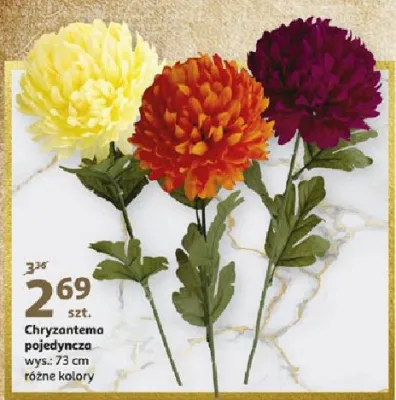 Cena produktu r贸偶ni si臋 w zale偶no艣ci od wybranego sklepu. Niestety nie posiadamy danych o aktualnych promocjach, jednak w艣r贸d archiwalnych ofert Chryzantema pojedyczna 73 cm kosztuje od 2,69 z艂.