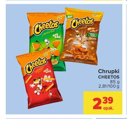 Cena produktu r贸偶ni si臋 w zale偶no艣ci od wybranego sklepu. Niestety nie posiadamy danych o aktualnych promocjach, jednak w艣r贸d archiwalnych ofert Chupki orzechowe Cheetos Frito lay cheetos kosztuje od 2,39 z艂.