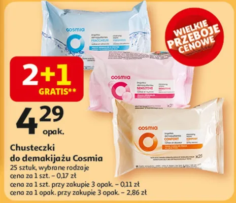 Cena produktu różni się w zależności od wybranego sklepu. Niestety nie posiadamy danych o aktualnych promocjach, jednak wśród archiwalnych ofert Chusteczki do demakijażu złuszczające Cosmia kosztuje od 2,86 zł do 4,29 zł.