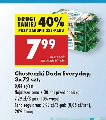 Cena produktu r贸偶ni si臋 w zale偶no艣ci od wybranego sklepu. Niestety nie posiadamy danych o aktualnych promocjach, jednak w艣r贸d archiwalnych ofert Chusteczki rumianek i alantoina Dada everyday kosztuje od 7,99 z艂 do 9,99 z艂.