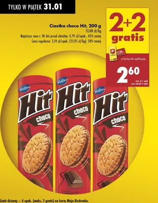 Cena produktu r贸偶ni si臋 w zale偶no艣ci od wybranego sklepu. Niestety nie posiadamy danych o aktualnych promocjach, jednak w艣r贸d archiwalnych ofert Ciastka czekoladowe Hit bahlsen kosztuje od 2,6 z艂.