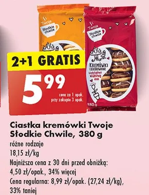 Cena produktu różni się w zależności od wybranego sklepu. Niestety nie posiadamy danych o aktualnych promocjach, jednak wśród archiwalnych ofert Ciastka kremówki dekorowane z wiśnią Twoje słodkie chwile kosztuje od 4 zł do 5,99 zł.