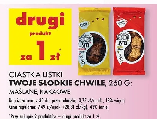 Zastanawiasz si臋, gdzie kupi膰 i ile kosztuje produkt Ciastka listki kakaowe Twoje s艂odkie chwile? Regularnie sprawdzamy, czy jest promocja na ten produkt w Biedronka, Lidl, Kaufland, Auchan, Netto, Makro i innych sklepach. Aktualnie nie posiadamy ofert promocyjnych na ten produkt.