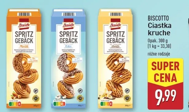 Cena produktu różni się w zależności od wybranego sklepu. Niestety nie posiadamy danych o aktualnych promocjach, jednak wśród archiwalnych ofert Ciastka maślane krążki z kawałkami karmelu Biscotto kosztuje od 9,99 zł.