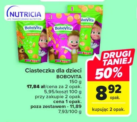 Cena produktu różni się w zależności od wybranego sklepu. Niestety nie posiadamy danych o aktualnych promocjach, jednak wśród archiwalnych ofert Ciastka z jabłkiem i brzoskwinią masza i niedźwiedź Bobovita kosztuje od 7,49 zł do 8,92 zł.