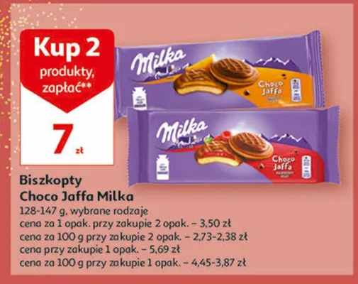 Cena produktu r贸偶ni si臋 w zale偶no艣ci od wybranego sklepu. Niestety nie posiadamy danych o aktualnych promocjach, jednak w艣r贸d archiwalnych ofert Ciastka z musem toffi Milka choco jaffa kosztuje od 3,5 z艂 do 3,99 z艂.