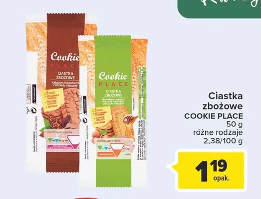 Przeglądaj podobne oferty promocyjne do Ciastka zbożowe z kawałkami czekolady mlecznej orzechami laskowymi i miodem Cookie place!