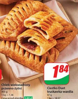 Cena produktu r贸偶ni si臋 w zale偶no艣ci od wybranego sklepu. Niestety nie posiadamy danych o aktualnych promocjach, jednak w艣r贸d archiwalnych ofert Ciastko duet truskawka-wanilia kosztuje od 1,39 z艂 do 1,84 z艂.