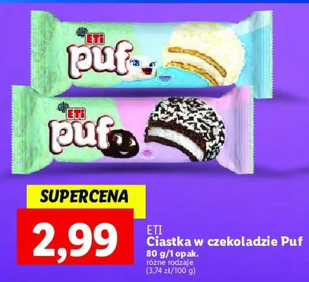 Cena produktu r贸偶ni si臋 w zale偶no艣ci od wybranego sklepu. Niestety nie posiadamy danych o aktualnych promocjach, jednak w艣r贸d archiwalnych ofert Ciastko w bia艂ej czekoladzie z wi贸rkami kokosowymi ETI PUF kosztuje od 2,99 z艂.
