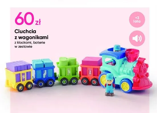 Zastanawiasz si臋, gdzie kupi膰 i ile kosztuje produkt Ciuchcia z wagonikami? Regularnie sprawdzamy, czy jest promocja na ten produkt w Biedronka, Lidl, Kaufland, Auchan, Netto, Makro i innych sklepach. Aktualnie nie posiadamy ofert promocyjnych na ten produkt.