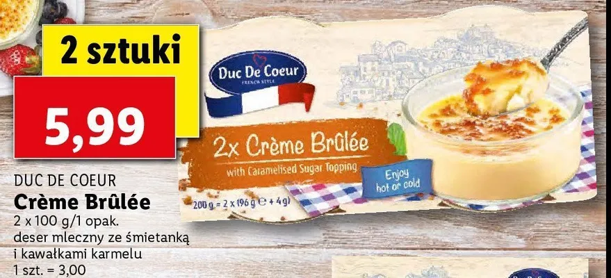 Cena produktu r贸偶ni si臋 w zale偶no艣ci od wybranego sklepu. Niestety nie posiadamy danych o aktualnych promocjach, jednak w艣r贸d archiwalnych ofert Creme brulee Duc de coeur kosztuje od 5,99 z艂.