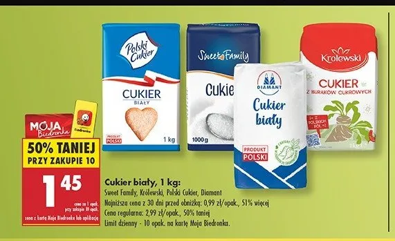 Zastanawiasz si臋, gdzie kupi膰 i ile kosztuje produkt Cukier Cukier kr贸lewski? Regularnie sprawdzamy, czy jest promocja na ten produkt w Biedronka, Lidl, Kaufland, Auchan, Netto, Makro i innych sklepach. Aktualnie nie posiadamy ofert promocyjnych na ten produkt.