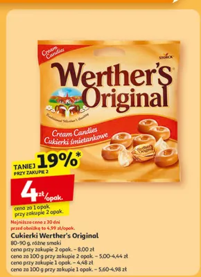 Cena produktu r贸偶ni si臋 w zale偶no艣ci od wybranego sklepu. Niestety nie posiadamy danych o aktualnych promocjach, jednak w艣r贸d archiwalnych ofert Cukierki caramel & creme Werther's original kosztuje od 3,99 z艂 do 4 z艂.