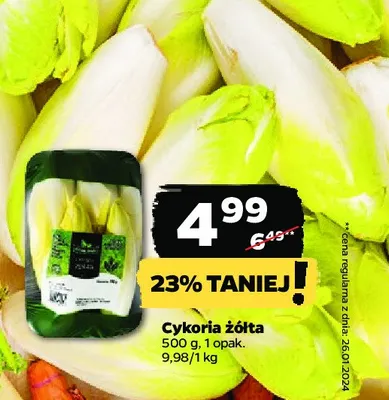 Cena produktu r贸偶ni si臋 w zale偶no艣ci od wybranego sklepu. Niestety nie posiadamy danych o aktualnych promocjach, jednak w艣r贸d archiwalnych ofert Cykoria 偶贸艂ta kosztuje od 3,99 z艂 do 6,99 z艂.