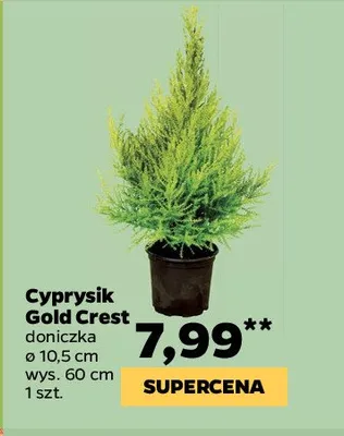Cena produktu r贸偶ni si臋 w zale偶no艣ci od wybranego sklepu. Niestety nie posiadamy danych o aktualnych promocjach, jednak w艣r贸d archiwalnych ofert Cyprys goldcrest wys. 60 cm kosztuje od 7,99 z艂.