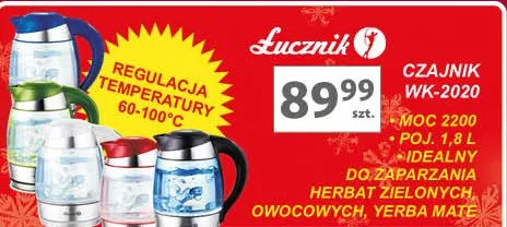 Cena produktu r贸偶ni si臋 w zale偶no艣ci od wybranego sklepu. Niestety nie posiadamy danych o aktualnych promocjach, jednak w艣r贸d archiwalnych ofert Czajnik wk 2020 czarny 艁ucznik kosztuje od 89 z艂 do 99,99 z艂.