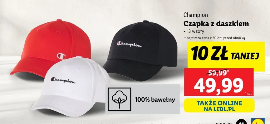Zastanawiasz si臋, gdzie kupi膰 i ile kosztuje produkt Czapka z daszkiem Champion? Regularnie sprawdzamy, czy jest promocja na ten produkt w Biedronka, Lidl, Kaufland, Auchan, Netto, Makro i innych sklepach. Aktualnie posiadamy 2 oferty promocyjne na ten produkt. Ceny zaczynaj膮 si臋 od 34,99z艂!