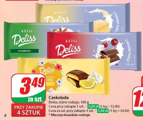 Cena produktu r贸偶ni si臋 w zale偶no艣ci od wybranego sklepu. Produkt Czekolada bia艂a Deliss mo偶esz kupi膰 w promocji ju偶 od 3,49 z艂. Najta艅sza oferta, jak膮 mamy w naszej bazie jest z sieci Dino. Czekolada bia艂a Deliss kosztuje aktualnie 3,49 z艂. Zobacz ofert臋