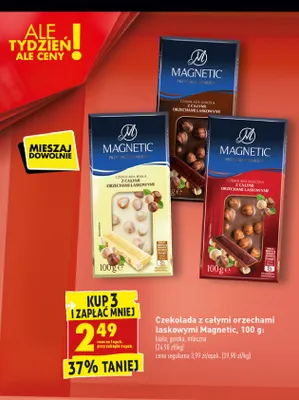 Cena produktu r贸偶ni si臋 w zale偶no艣ci od wybranego sklepu. Niestety nie posiadamy danych o aktualnych promocjach, jednak w艣r贸d archiwalnych ofert Czekolada ciemna z orzechami Magnetic kosztuje od 2,49 z艂.