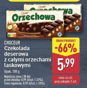 Cena produktu r贸偶ni si臋 w zale偶no艣ci od wybranego sklepu. Produkt Czekolada deserowa z ca艂ymi orzechami laskowymi Choceur mo偶esz kupi膰 w promocji ju偶 od 4,99 z艂. Najta艅sza oferta, jak膮 mamy w naszej bazie jest z sieci Aldi. Czekolada deserowa z ca艂ymi orzechami laskowymi Choceur kosztuje aktualnie 4,99 z艂. Zobacz ofert臋
