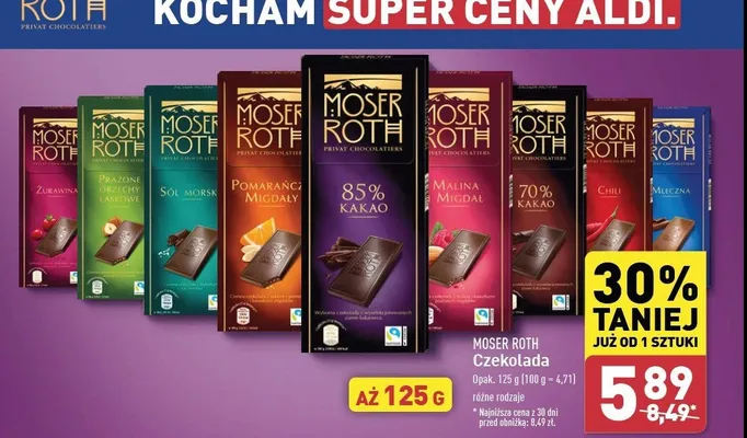Cena produktu różni się w zależności od wybranego sklepu. Niestety nie posiadamy danych o aktualnych promocjach, jednak wśród archiwalnych ofert Czekolada gorzka z kawałkami pomarańczy i migdałów Moser roth kosztuje od 4,7 zł do 5,89 zł.