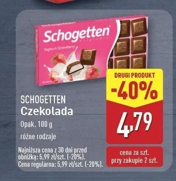 Cena produktu r贸偶ni si臋 w zale偶no艣ci od wybranego sklepu. Niestety nie posiadamy danych o aktualnych promocjach, jednak w艣r贸d archiwalnych ofert Czekolada jogurtowo-truskawkowa Schogetten kosztuje od 2,99 z艂 do 4,79 z艂.
