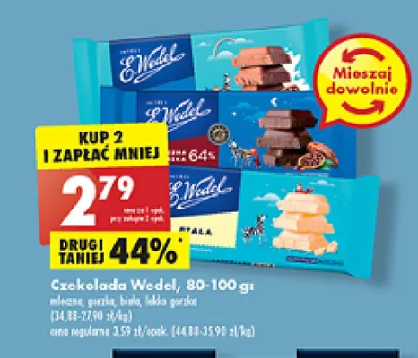 Cena produktu r贸偶ni si臋 w zale偶no艣ci od wybranego sklepu. Produkt Czekolada lekko gorzka E. wedel mo偶esz kupi膰 w promocji ju偶 od 4,79 z艂 do 16,99 z艂. Najta艅sza oferta, jak膮 mamy w naszej bazie jest z sieci Tw贸j Market. Czekolada lekko gorzka E. wedel kosztuje aktualnie 4,79 z艂. Zobacz ofert臋