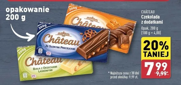 Ile kosztuje Czekolada mleczna ze s艂onymi precelkami Chateau Chateau (aldi)?