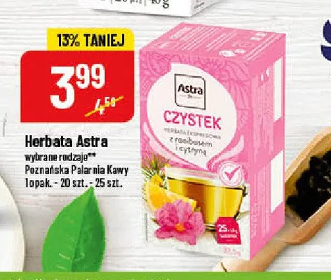 Cena produktu r贸偶ni si臋 w zale偶no艣ci od wybranego sklepu. Niestety nie posiadamy danych o aktualnych promocjach, jednak w艣r贸d archiwalnych ofert Czystek Astra tea kosztuje od 3,99 z艂.