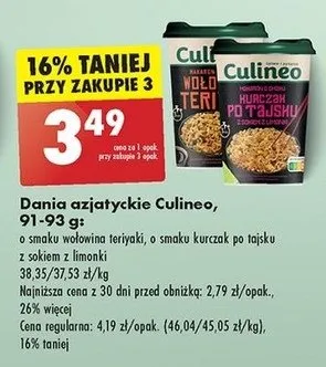 Cena produktu różni się w zależności od wybranego sklepu. Niestety nie posiadamy danych o aktualnych promocjach, jednak wśród archiwalnych ofert Danie azjatyckie wołowina teriyaki Culineo kosztuje od 2,99 zł do 3,49 zł.