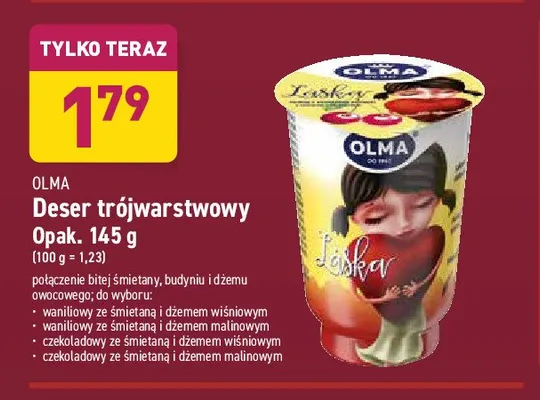 Cena produktu różni się w zależności od wybranego sklepu. Niestety nie posiadamy danych o aktualnych promocjach, jednak wśród archiwalnych ofert Deser czekoladowy ze śmietaną i dżemem wiśniowym Olma kosztuje od 1,79 zł do 1,99 zł.