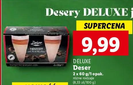 Cena produktu r贸偶ni si臋 w zale偶no艣ci od wybranego sklepu. Niestety nie posiadamy danych o aktualnych promocjach, jednak w艣r贸d archiwalnych ofert Deser milk & dark chocolate Deluxe kosztuje od 8,99 z艂 do 9,99 z艂.