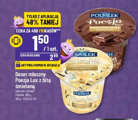 Cena produktu różni się w zależności od wybranego sklepu. Niestety nie posiadamy danych o aktualnych promocjach, jednak wśród archiwalnych ofert Deser waniliowy z bitą śmietanką waniliową Poezja lux kosztuje od 1,5 zł do 1,69 zł.