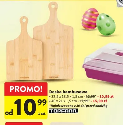 Cena produktu r贸偶ni si臋 w zale偶no艣ci od wybranego sklepu. Produkt Deska bambusowa do krojenia 32.5 x 18.5 x 1.5 cm TOPFANN mo偶esz kupi膰 w promocji ju偶 od 24,99 z艂 do 27,99 z艂. Najta艅sza oferta, jak膮 mamy w naszej bazie jest z sieci Intermarche. Deska bambusowa do krojenia 32.5 x 18.5 x 1.5 cm TOPFANN kosztuje aktualnie 24,99 z艂. Zobacz ofert臋
