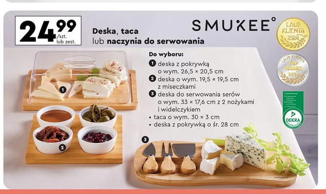 Cena produktu r贸偶ni si臋 w zale偶no艣ci od wybranego sklepu. Produkt Deska bambusowa z miseczkami Smukee kitchen mo偶esz kupi膰 w promocji ju偶 od 16,99 z艂. Najta艅sza oferta, jak膮 mamy w naszej bazie jest z sieci Auchan. Deska bambusowa z miseczkami Smukee kitchen kosztuje aktualnie 16,99 z艂. Zobacz ofert臋