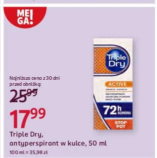 Cena produktu r贸偶ni si臋 w zale偶no艣ci od wybranego sklepu. Niestety nie posiadamy danych o aktualnych promocjach, jednak w艣r贸d archiwalnych ofert Dezodorant 72 h TRIPLE DRY kosztuje od 15,99 z艂 do 17,99 z艂.