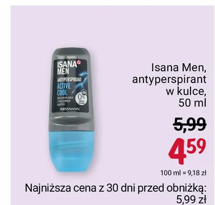 Cena produktu r贸偶ni si臋 w zale偶no艣ci od wybranego sklepu. Niestety nie posiadamy danych o aktualnych promocjach, jednak w艣r贸d archiwalnych ofert Dezodorant active cool Isana for men kosztuje od 4,19 z艂 do 4,59 z艂.
