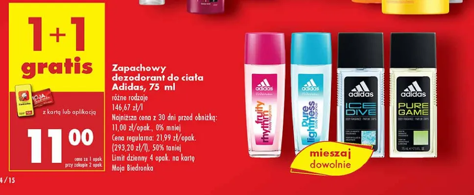 Cena produktu r贸偶ni si臋 w zale偶no艣ci od wybranego sklepu. Niestety nie posiadamy danych o aktualnych promocjach, jednak w艣r贸d archiwalnych ofert Dezodorant Adidas cosmetics kosztuje od 11 z艂 do 17,99 z艂.