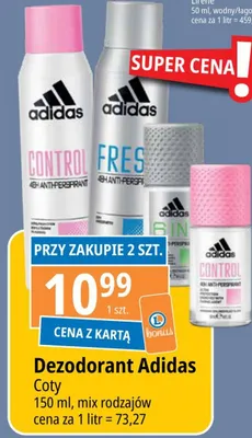 Cena produktu r贸偶ni si臋 w zale偶no艣ci od wybranego sklepu. Produkt Dezodorant Adidas men fresh mo偶esz kupi膰 w promocji ju偶 od 8,99 z艂 do 10,99 z艂. Najta艅sza oferta, jak膮 mamy w naszej bazie jest z sieci ABC. Dezodorant Adidas men fresh kosztuje aktualnie 8,99 z艂. Zobacz ofert臋