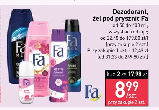 Cena produktu r贸偶ni si臋 w zale偶no艣ci od wybranego sklepu. Niestety nie posiadamy danych o aktualnych promocjach, jednak w艣r贸d archiwalnych ofert Dezodorant citrus green Fa men sport kosztuje od 7,99 z艂 do 10,99 z艂.