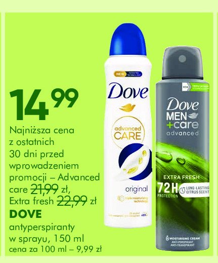 Cena produktu r贸偶ni si臋 w zale偶no艣ci od wybranego sklepu. Niestety nie posiadamy danych o aktualnych promocjach, jednak w艣r贸d archiwalnych ofert Dezodorant extra fresh Dove men+care kosztuje od 11,55 z艂 do 14,99 z艂.