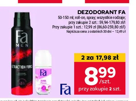 Cena produktu r贸偶ni si臋 w zale偶no艣ci od wybranego sklepu. Niestety nie posiadamy danych o aktualnych promocjach, jednak w艣r贸d archiwalnych ofert Dezodorant Fa men attraction force kosztuje od 8,44 z艂 do 9,99 z艂.