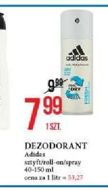 Cena produktu r贸偶ni si臋 w zale偶no艣ci od wybranego sklepu. Niestety nie posiadamy danych o aktualnych promocjach, jednak w艣r贸d archiwalnych ofert Dezodorant fresh Adidas cool & dry Adidas cosmetics kosztuje od 7,99 z艂.