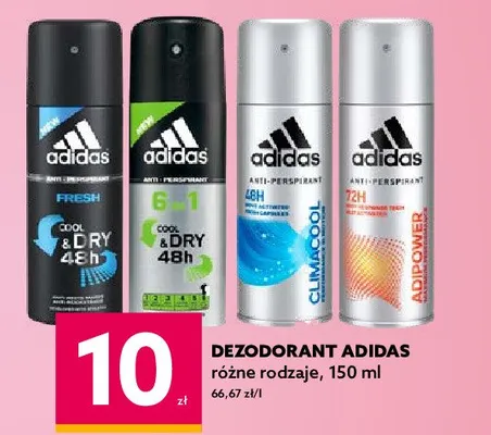 Cena produktu r贸偶ni si臋 w zale偶no艣ci od wybranego sklepu. Niestety nie posiadamy danych o aktualnych promocjach, jednak w艣r贸d archiwalnych ofert Dezodorant fresh Adidas men cool & dry 48h Adidas cosmetics kosztuje od 9,99 z艂 do 10 z艂.