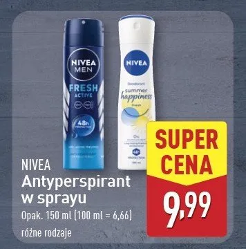 Cena produktu r贸偶ni si臋 w zale偶no艣ci od wybranego sklepu. Niestety nie posiadamy danych o aktualnych promocjach, jednak w艣r贸d archiwalnych ofert Dezodorant fresh Nivea summer happiness kosztuje od 9,99 z艂 do 11,99 z艂.