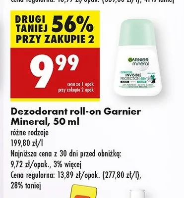 Cena produktu r贸偶ni si臋 w zale偶no艣ci od wybranego sklepu. Niestety nie posiadamy danych o aktualnych promocjach, jednak w艣r贸d archiwalnych ofert Dezodorant niebieski Garnier mineral invisible kosztuje od 7 z艂 do 12,99 z艂.